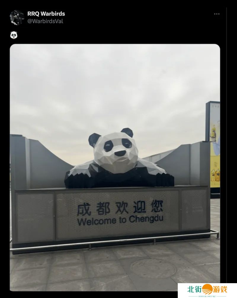 RRQ主教练Warbirds晒出抵达成都双流机场后的标志性大熊猫建筑。