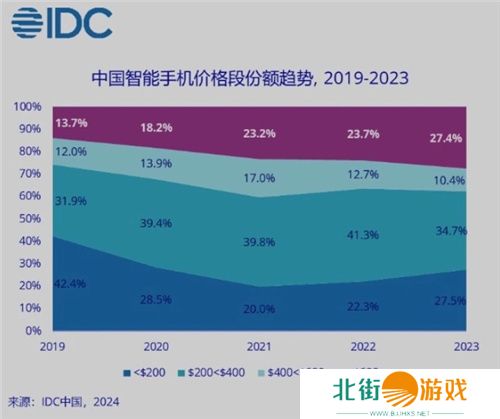 除了AI,高端化将仍然是今年手机市场追逐的主要目标。根据调研机构 IDC 的报告,2023 年,中国智能手机市场 600 美元以上高端市场份额达 27.4%,同比增长了 3.7 个百分点,而代表中端的 200-600 美元产品的市场空间正在收窄。