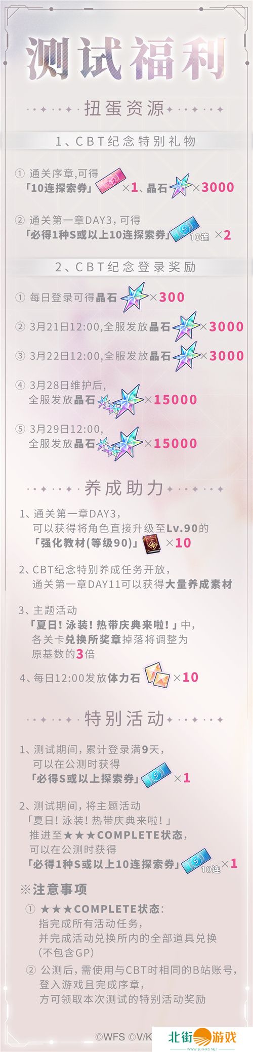 为便于玩家们体验剧情,测试中将额外开放「CBT纪念养成助力」活动,发放强化教材、养成道具及体力石等素材,同时在测试期间还将陆续发放至少可进行150连的扭蛋道具!此外,还有丰厚的充值返利活动,测试期间「在一定额度内累计获得的付费晶石」,将在游戏正式公测后全额返还到测试账号内,并加倍返还免费晶石!最后,测试期间完成指定活动任务,还可以在公测时额外获得「必得1种S或以上10连探索券」等奖励!完整测试福利内容介绍如下,可点击长图查看。