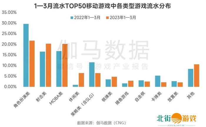 今年4月,伽马数据发布的《2023年1-3月游戏产业报告》中披露了一组品类流水分布数据,从图表可以看出,目前角色扮演(MMO)和射击(FPS)仍是最头部的两大赛道,但同样对比去年数据来说,二者的走势却出现了明显的背离: