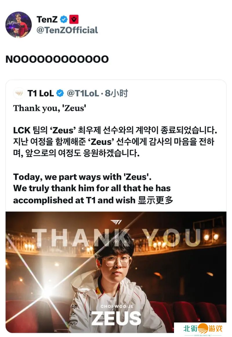 TenZ因T1宣布Zeus离队的消息在社交媒体上发文感叹。近日T1官方宣布与LCK上单选手Zeus的合同到期,正式结束合作。