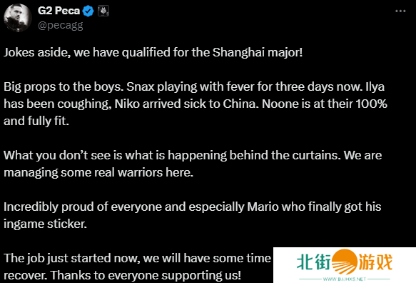 Spirit后晋级Major,G2战队经理Peca发文恭喜战队晋级,并称赞队员们是真正的战士。