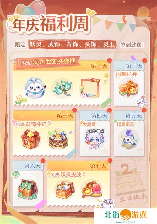 欢庆二周年,豪礼送不停!惊喜福利周来临,登录即可领取海量豪礼!御灵师在活动期间登录签到即可领取周年限定宠、纪念武饰、背饰、头饰、妖灵皮肤,以及灵玉、坊市五折券、绮罗华章、妖灵成长果等惊喜福利!