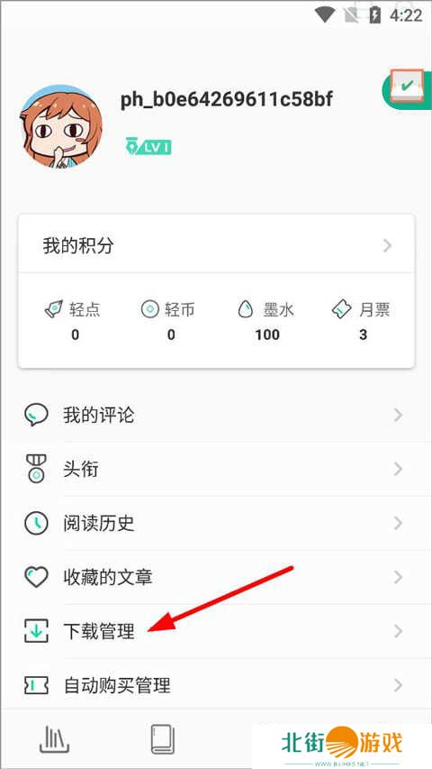 6、文章下载后可打开个人中心页面,用户可查看阅读历史、收藏文章等,点击下载管理;