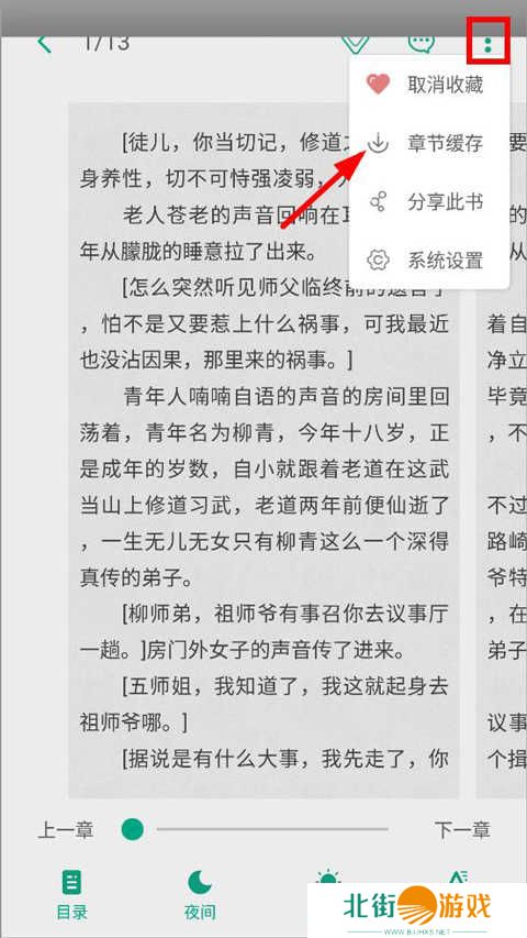 5、也可进入正文页面,单击屏幕,点击右上角“...”,下拉选择章节缓存;