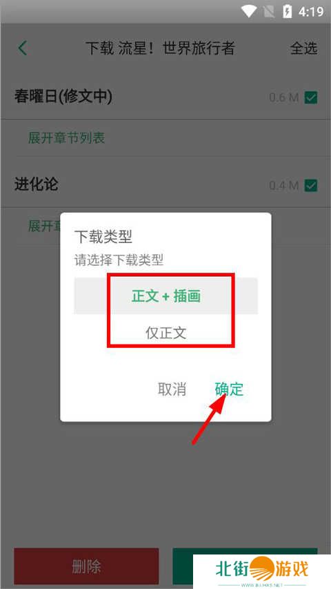 4、选择下载类型(正文+插画、伪正文),点击确定;