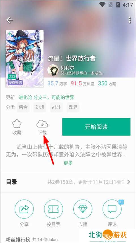 2、进入小说主页面,用户可收藏、阅读、分享、评论小说,点击阅读键旁边的下载按钮;