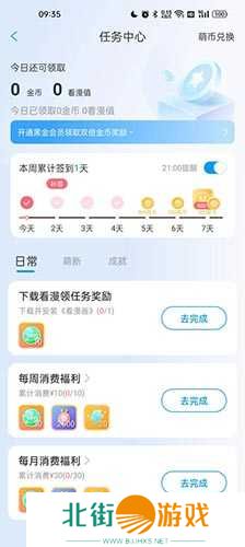 4、之后会来到任务中心页面,完成下列相应的任务可以获得萌币奖励。