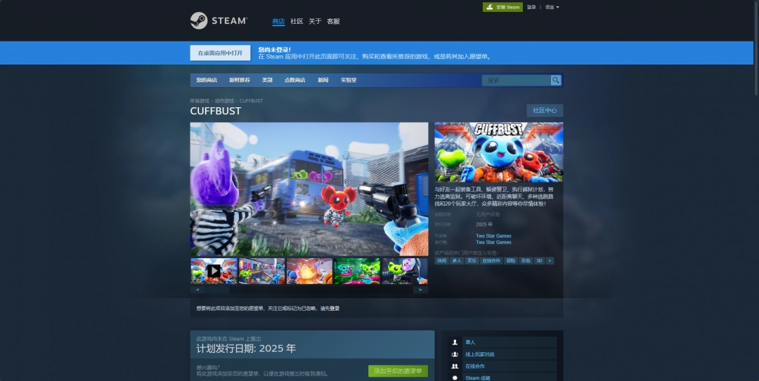 《CUFFBUST》是一款非常有趣的多人在线合作游戏,而这款游戏的下载网址就是购买平台的购买页面,比如Steam版就是在购买页面购买之后,点击页面中的马上开玩就可以开始下载了。