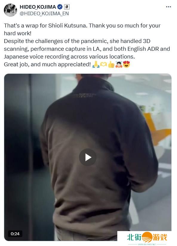 小岛秀夫在推文中表示:“忽那汐里的工作就到此结束了。非常感谢您的辛勤工作!尽管面临疫情的挑战,她仍然在洛杉矶完成了3D扫描、动作捕捉以及在不同地点进行的英语ADR和日语配音录制。做得好,非常感谢!”