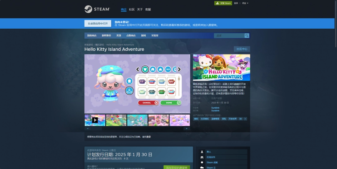 Steam平台购买链接:https://store.steampowered.com/app/2495100/Hello_Kitty_Island_Adventure/。