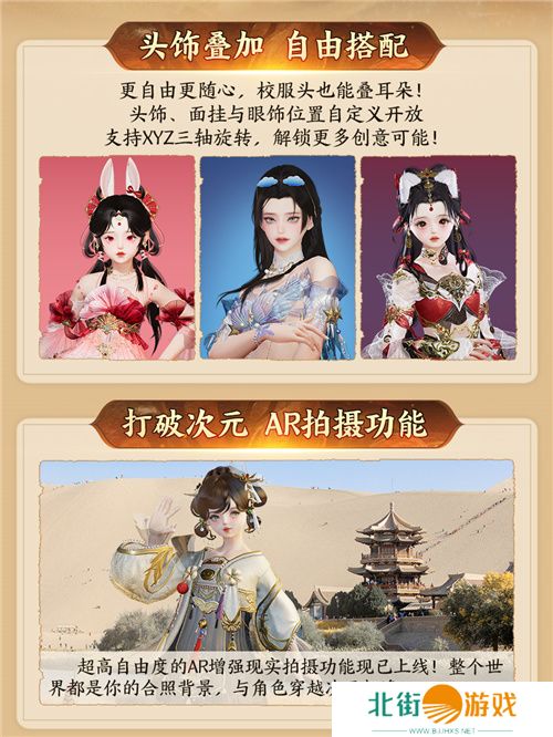 打破更多桎梏,为新颖搭配提供更大的创意空间,成衣分类里的大部分帽子外观(头冠、耳朵等)将会划入新增的饰品类型【头饰】里,与外观收集里的帽子拓印相区分。与此同时,移动端AR增强现实功能正式上线,光照、倒影、横竖机位、表情动作……超高自由度,一切由你定义!