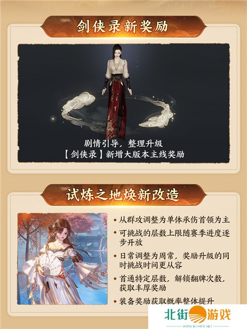 千帆过,江湖故事再添墨。为了让侠士更加清晰地探知背景故事,【剑侠录】以全新面貌与侠士再会,大版本主线奖励全面升级,精美武技殊影图和专属称号逐一登场,免费获取全民可得!试炼之地焕新改造后,保留高层关卡获取无封装备的难度(即现行PVE玩法最高难度追求)的同时,让其余各个阶段的关卡都有对应的奖励,欢迎更多侠士尝试和参与!