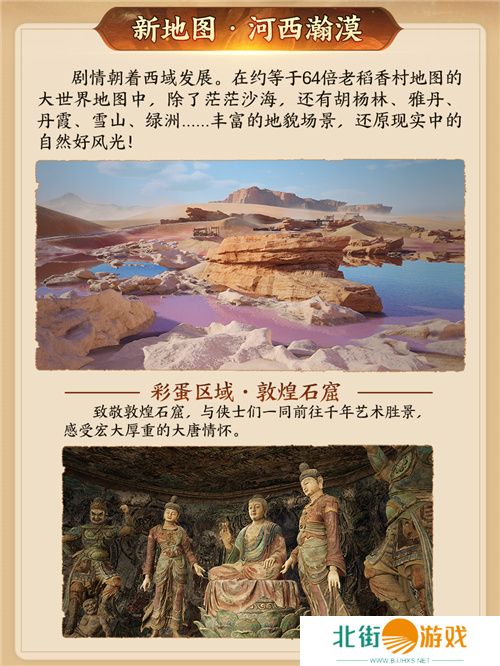 携手有爱玩家及中国敦煌石窟保护研究基金会,《剑网3》为莫高窟保护性展示工程贡献了一份来自大唐侠士的力量。而在游戏内,我们也在全新西域大世界场景“河西瀚漠”中致敬敦煌石窟,为侠士们展现这背后多彩而灵动的艺术魅力与文化内涵。这里是横贯欧亚大陆的古老商道,是古代东西方贸易的桥梁,让我们一同于方寸屏幕间纵览万里风烟,塞外风韵!