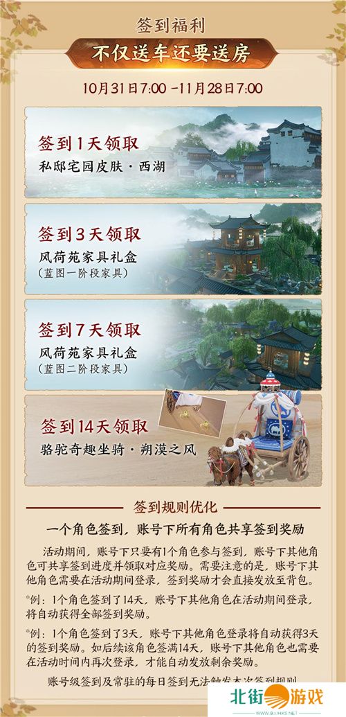 签到首日即可领取杭州西湖景区同款私邸宅园皮肤,价值120万园宅币的同主题配套绿柳清荷家具礼盒参与活动免费可得,拎包直接入住!除此以外,踏入风沙扑面的西域大世界,不如再带上“新车”吧!骆驼奇趣坐骑“朔漠之风”将踏着专属仙人掌脚印,优哉游哉,不紧不慢,陪你从容游瀚漠,驰骋西域大世界!