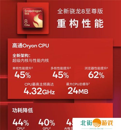 骁龙8至尊版集成第二代高通Oryon CPU,基于台积电第二代3nm制程工艺,采用“2+6”设计——拥有2颗4.32GHz的超级内核(比骁龙X Elite双核增强的4.3GHz还要高一点)以及6颗3.53GHz的性能内核,取消了能效核。