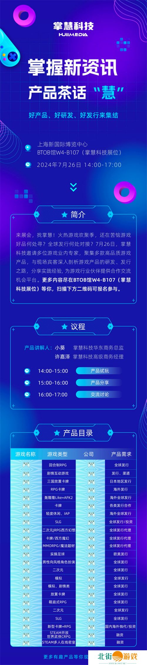据悉,这场由掌慧科技HuiiMedia在7月26日下午14:00主办的【掌握新资讯:产品茶话“慧”】产品、研发、发行三方对接会,除了汇集50多款游戏进行现场分享以外,主办方还将邀约30位游戏厂商产品、媒介、商务负责人齐聚掌慧科技ChinaJoy展台(BTOB馆W4-B107)