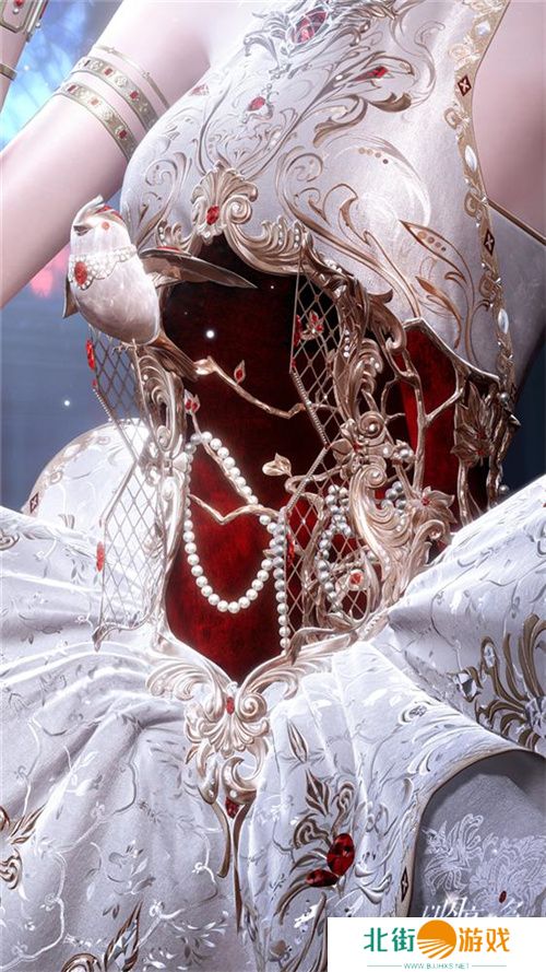 鞋子的设计已经如此用心了,套装的设计概念和主题更是一目了然。要将中国传统德化白瓷与泉州提线木偶戏的设计元素融合在一套服装上,还是有很大挑战性的,除了整体的用色和陶瓷的质感之外,此次的傀儡之章新版本的主推套装还增加了许多更有趣的设计。比如为了凸显腰部的线条,在参考前期发条之心套装镂空腹部的设计之外,这一次官方给这个镂空的设计加入了浓墨重彩的一笔。正如在版本宣传片中看到的那样,一只点缀着各种宝石和水晶的金属小鸟,仿佛为这个镂空设计注入了灵魂。更惊喜的地方在于,镂空双开门鸟笼打开的时候,居住在其中的小鸟便会飞奔而出,与角色紧紧相随并进行专属的亲密互动。