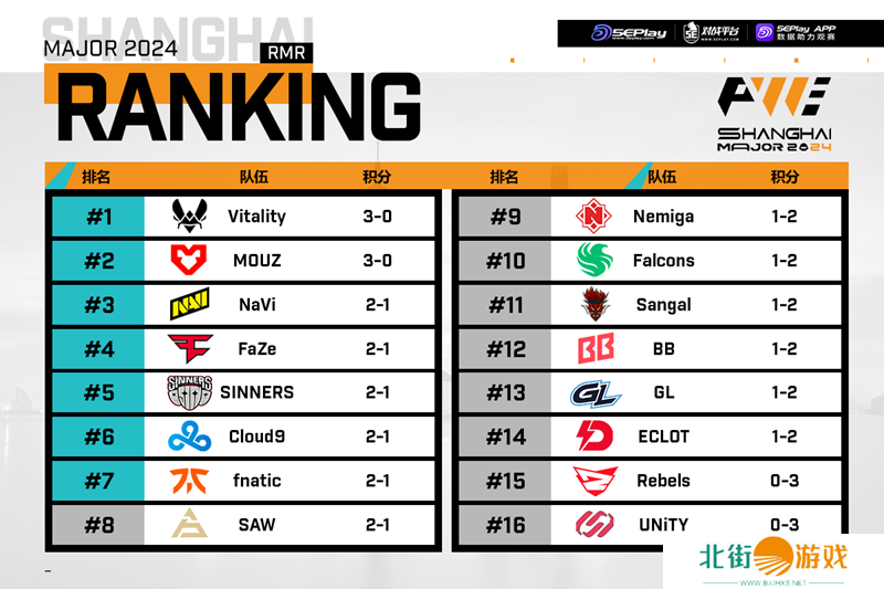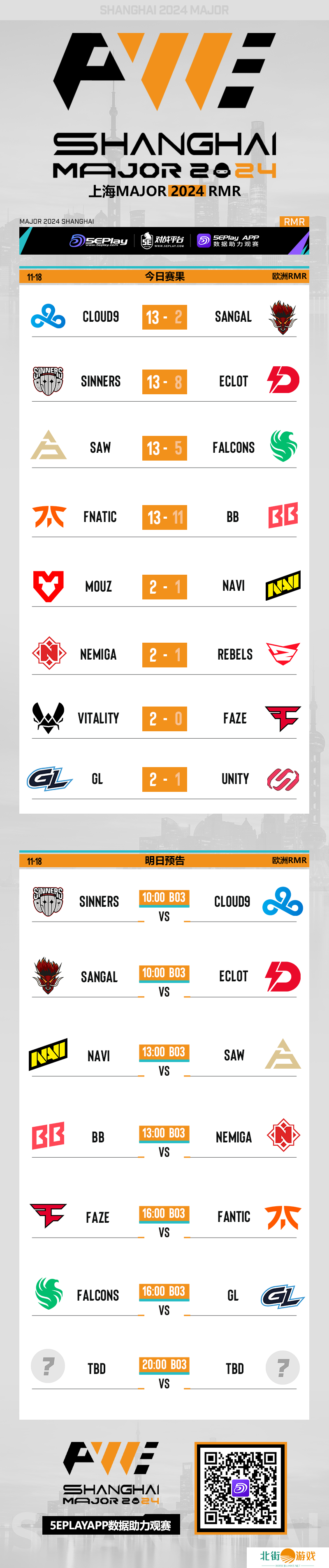 FaZe则还需要一场胜利。SINNERS、C9和fnatic则是位列第5-7位。以下为今日赛果、明日预告和积分图一览。