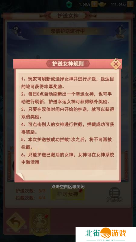 作为女神系统里面的趣味玩法之一,护送女神可是难得与自家女神培养感情的好时刻,况且每一次护送还有丰厚的额外奖励可以拿。不过由于女神们人气太高,所以护送女神也不可能一帆风顺,中途还会遭遇到其他道友们的拦截,说不得其中就有八戒派来的卧底,道友们可要注意小心提防。