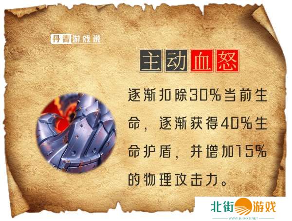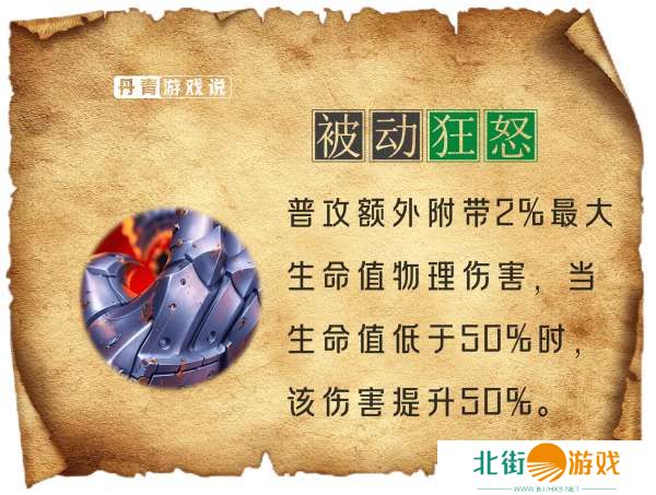 狂怒的存在,使英雄的普攻伤害更高,在血量下降至50%以下,仍有一定的输出能力。
