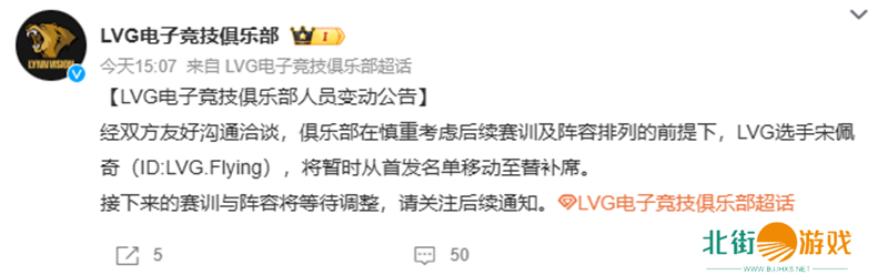 经双方友好沟通洽谈,俱乐部在慎重考虑后续赛训及阵容排列的前提下,LVG选手宋佩奇(ID:LVG.Flying),将暂时从首发名单移动至替补席。
