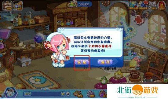 4、在宠物医院里点击魔法泉水就会弹出对话框,直接点击恢复即可。