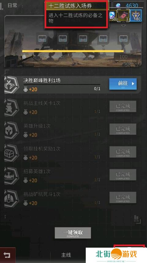 答:游戏中玩家可以通过完成日常任务活跃度到100点得到十二胜入场券。