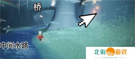 3、来到密林遗迹地图后一直往前飞,在一个桥的右前方有个小洞口。