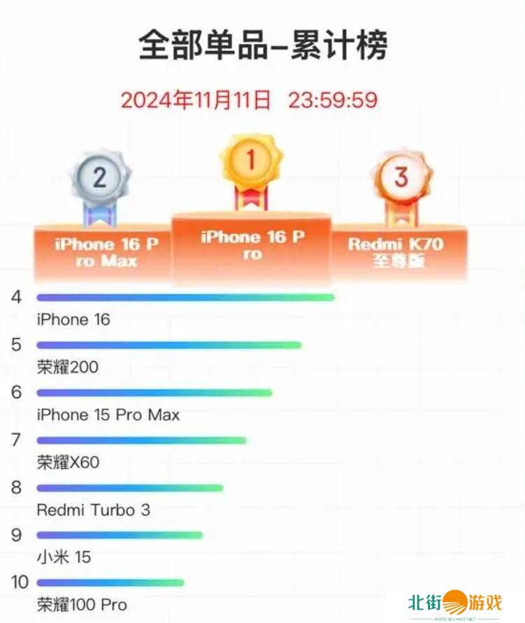 根据JD平台的数据,我们可以一窥今年双11手机市场的格局。在总销量榜单上,苹果表现抢眼,共有4款机型跻身前十,占据40%的席位,分别位列第1、2、4、6名。小米则紧随其后,以3款机型上榜,占据30%的比例,分别获得第3、8、9名。荣耀品牌也有3款手机上榜,与苹果和小米共同瓜分了前十名的位置。