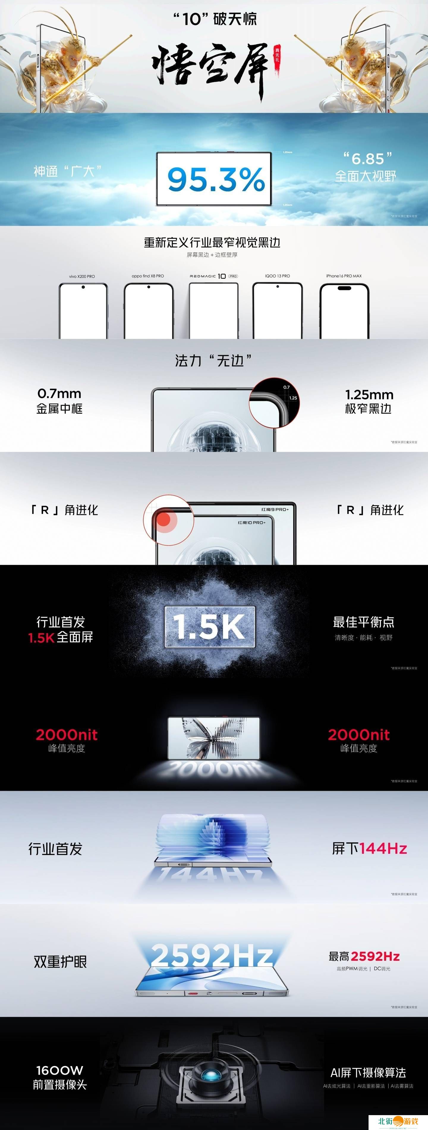 红魔10 Pro不仅拥有1.25mm的窄黑边和0.7mm的窄边框壁厚,更首次推出了1.5K全面屏,支持高达144Hz的刷新率,峰值亮度可达2000nit,确保在任何光线条件下都能清晰呈现画面。