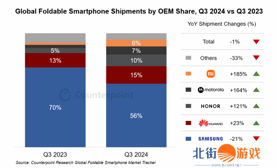在这场市场波动中,三星作为全球折叠屏手机市场的领头羊,其表现却不尽如人意。尽管依然占据市场首位,但三星的出货量同比大幅下滑了21%,成为前五大品牌中唯一出现销量下滑的品牌,且降幅显著。