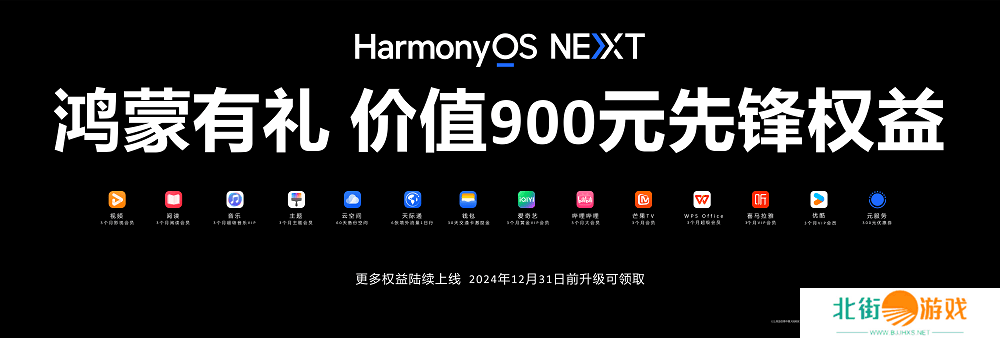 为了鼓励更多用户升级原生鸿蒙系统,华为推出了总价值900元的“鸿蒙有礼”HarmonyOS NEXT先锋权益。这些权益包括华为视频、阅读、音乐、主题、云空间、天际通、钱包等应用的会员和活动权益,以及爱奇艺、哔哩哔哩、芒果TV、WPS Office、喜马拉雅、优酷等第三方应用的会员和优惠券。所有在2024年12月31日前参与原生鸿蒙升级的用户,均可领取以上福利。