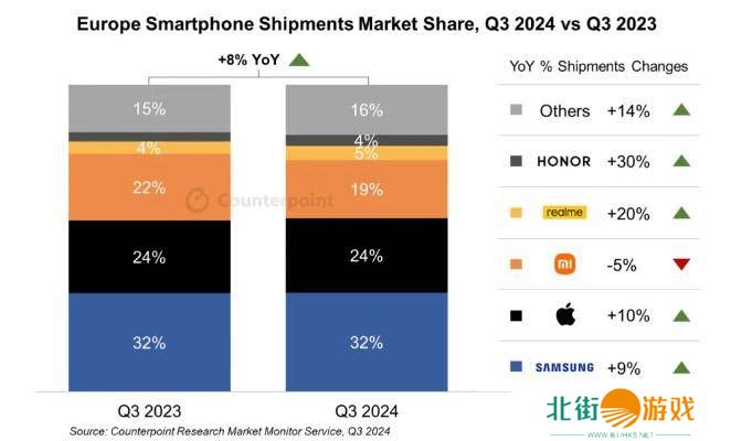 相比之下,小米在本季度的表现略显逊色,其出货量同比下降了5%,排名第三。然而,这并不意味着小米在欧洲市场的竞争力减弱,而是反映了市场竞争的激烈程度以及消费者偏好的多样化。与此同时,realme和荣耀则展现出了强劲的增长势头,分别以20%和30%的同比增长率位列第四和第五,显示出它们在产品创新、市场定位和营销策略上的成功。