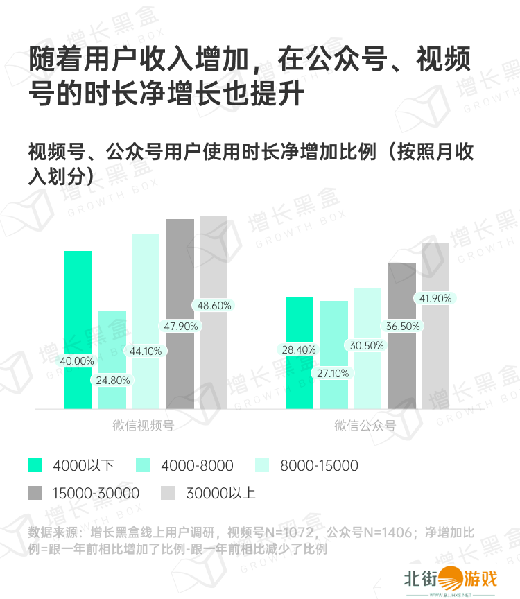 研究首先从用户行为出发,探讨了微信内容生态的增长趋势和用户画像。调研发现,视频号的新用户增量显著,且30岁以下的年轻人占比越来越高,成为增长的核心驱动力。同时,高收入人群在视频号和公众号上的使用时间也有显著增加。