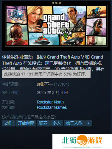 目前在Steam平台,《GTA5》PC次世代版本(官方名称《GTA5 增强版》),仅仅只有53%的好评率,为系列最低。这项数据,甚至不如此前外包团队开发的《GTA三部曲》。