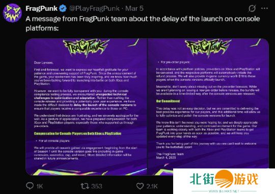 此外,Xbox和PlayStation上的预购将被取消,并自动启动退款流程。当主机版本正式发布时,官方将向主机玩家提供价值10美元的虚拟货币作为此次延期的补偿。