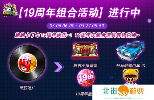 使用“黑胶唱片”,参与3月6日 06:00至3月27日05:59期间开启的<19周年组合活动>,将可兑换包括“野马敞篷跑车 迅(无限制)”、“复古小屋背景(无限制)”、“复古头饰(无限制)”、“19周年车牌(无限制)”、“19周年徽章(无限制)”等在内的19周年活动道具!