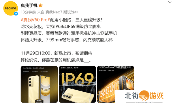 近日,真我手机市场动作频频,不仅预告了真我Neo7新机的盛大发布——定于12月11日揭开神秘面纱,还悄然宣布了另一款新机真我V60 Pro即将面市的具体日期。据真我手机官方消息,真我V60 Pro将于11月29日上午10时,在官方商城正式上架销售。