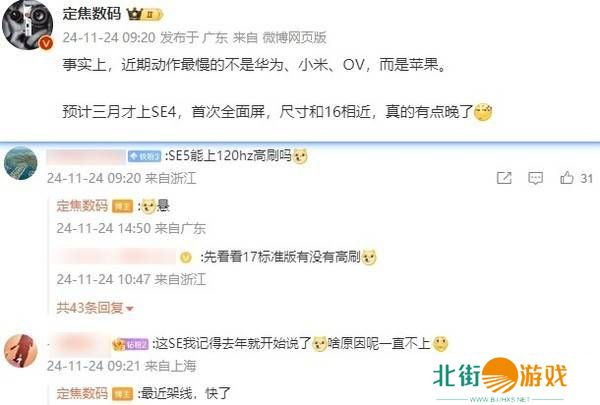 对于iPhone SE 4的延迟发布,不少网友表示早已有所耳闻,但为何迟迟未见真机?对此,爆料博主仅简单地回复了一个“快了”,让粉丝们既期待又焦急。而关于更远的下一代产品——iPhone SE 5,网友们同样充满了好奇。当被问及iPhone SE 5是否会搭载120Hz高刷屏时,博主则给出了一个模棱两可的答案“悬”,暗示这一配置在SE 5上出现的可能性并不高。