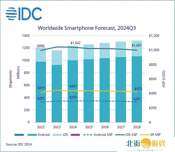 尽管面临重重挑战,IDC依然认为苹果公司的利润率保持在较高水平。这主要得益于其高昂的售价,平均超过1000美元,相比之下,安卓手机的平均售价仅为295美元,不到iPhone的三分之一。然而,IDC也预测,未来几年苹果的增长率将维持在个位数水平,这主要受到换机周期延长、发达经济体市场饱和以及二手交易迅速增长等因素的影响。