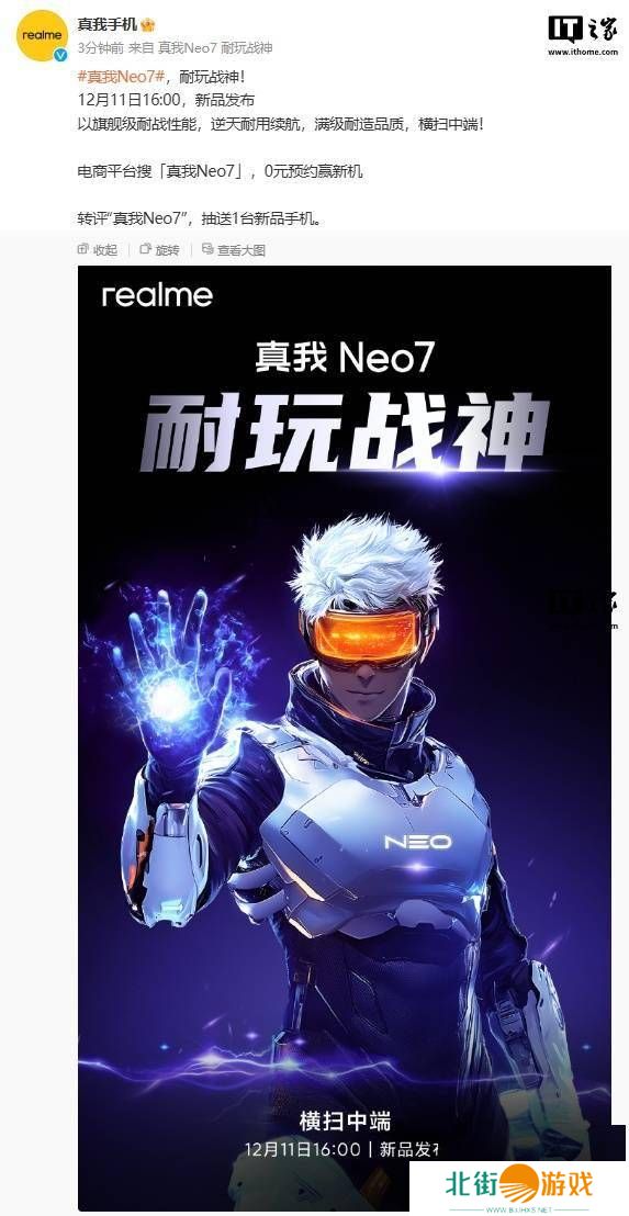 realme今日正式宣布,其备受期待的真我Neo7智能手机将于12月11日下午4点正式发布。这款新机被标榜为“中端市场的全能战士”,以其卓越的耐用性能、超长续航及高品质,准备在中端市场掀起波澜。