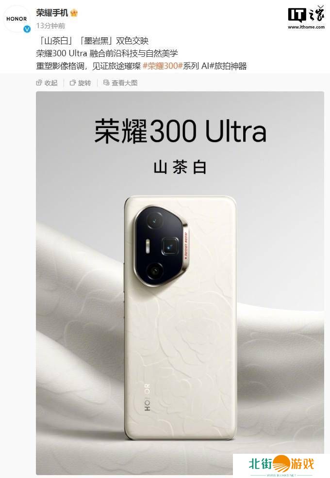 荣耀近日正式揭晓了其最新旗舰机型荣耀300 Ultra的外观设计,通过官方渠道发布了山茶白与墨岩黑两款配色的高清图片,标志着荣耀300系列三款手机的外观已经全部亮相于公众面前。