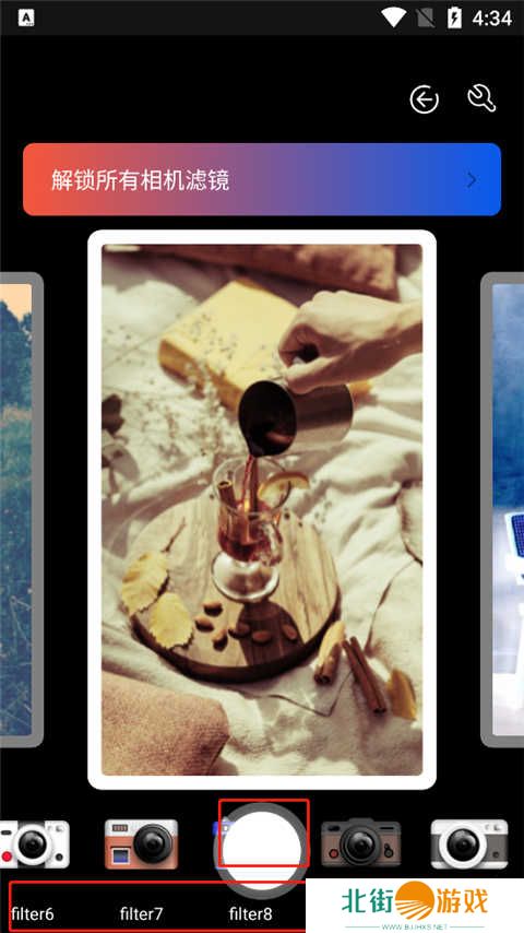 1、进入软件,它为用户提供了海量的胶卷滤镜,你只需选择自己喜欢的滤镜,点击中间的拍照键即可;