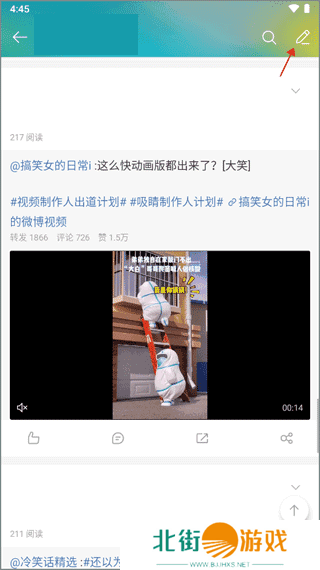 5、当然,如何发微博(WeiboIntl)也是很重要的,在右上角找到一个铅笔书写符号,写上你想说的内容,