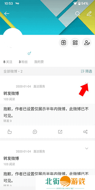 3、然后找到不想让他人看的微博,并点击旁边的下拉箭头