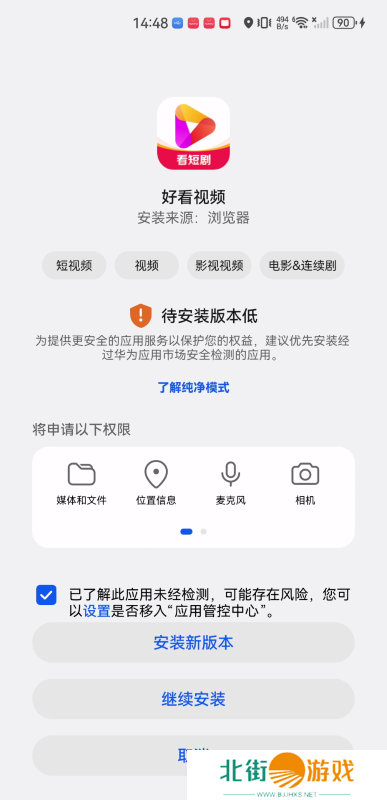 3、第三步,点击勾选“已了解此应用未经检测……”,然后再点击“继续安装”。(出现安全提醒,不用惊慌)
