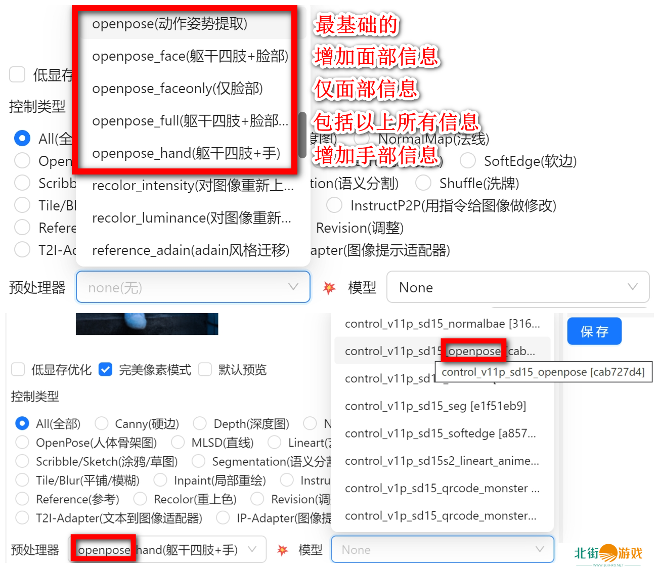 这里可以看到openpose的预处理器有5个,根据需要的进行筛选。