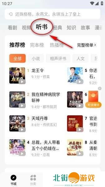 打开软件后,在“书城”那一栏选择“听书”,进入听书专区;