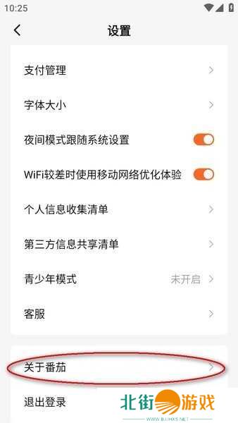 进入设置以后,前面的都不用管,直接滑动到底部,点击“关于番茄”;